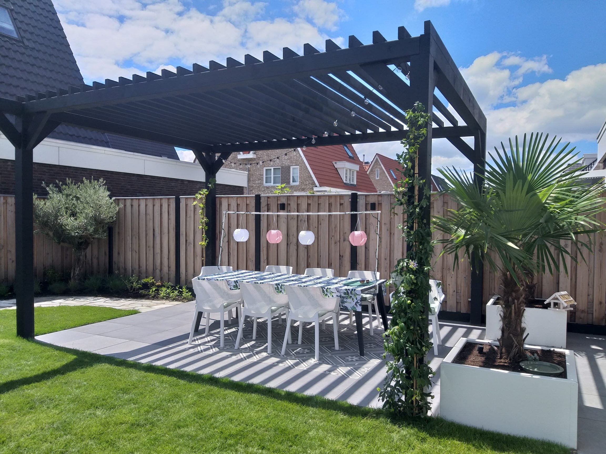 Een oosterse tuin waar rust, eenvoud en stijl samenkomen. Met een gazon voor ruimte, een tegelpad voor beleving en een pergola als blikvanger is dit een tuin die uitnodigt tot ontspanning en een gevoel van balans en harmonie geeft.